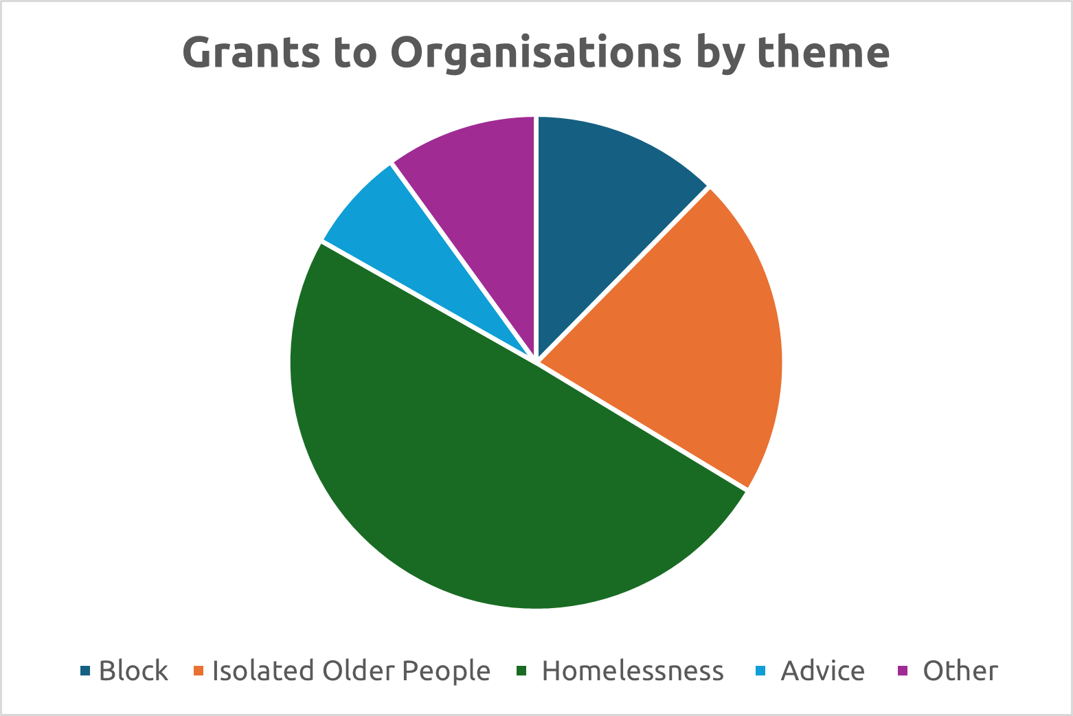Over the past decade, we’ve awarded £464,905 in 56 grants to local organisations. This includes Block Grants where they pass on funding to their clients and Project Grants providing services that address our key themes of older people, homelessness and independent advice.
