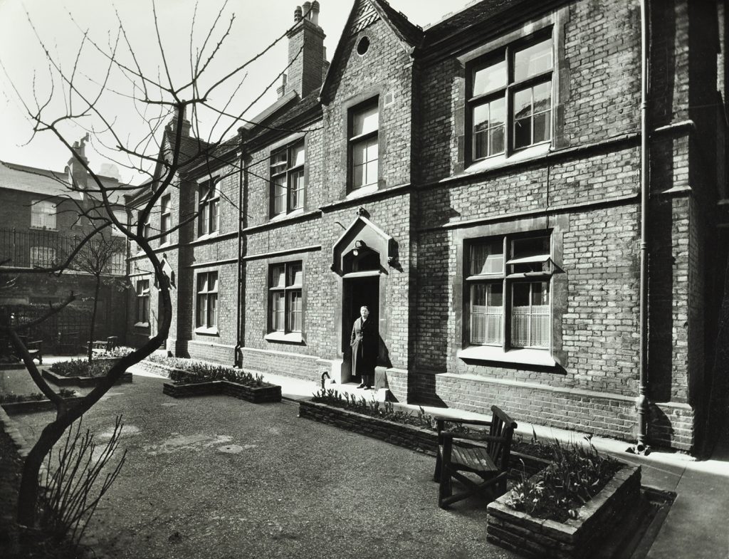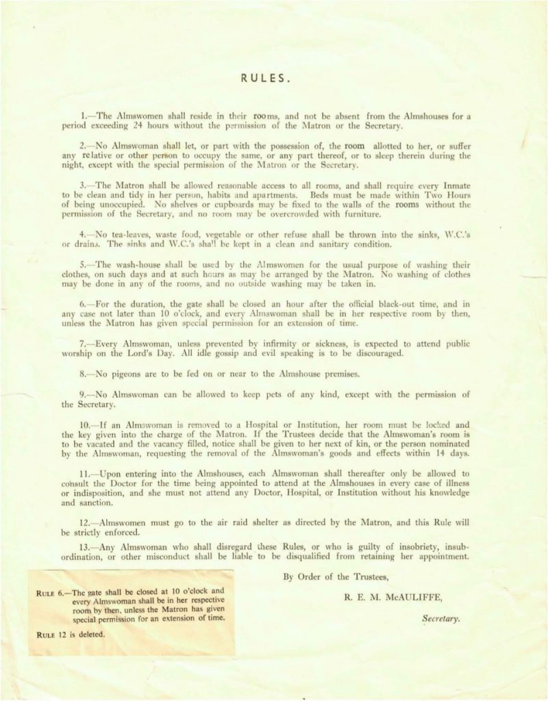 Those almshouses were demolished in 1885 and rebuilt on the same site, to which further land was added to provide accommodation in bedsitting rooms for ten almswomen, a flat for a matron and a boardroom for the trustees. The almshouses were modernised in 1954, when kitchens were added to each bedsitting room and shared bathrooms were provided. In 2003-4, the almshouses were again remodelled to provide eight two-roomed flats, each with their own kitchen and bathroom.