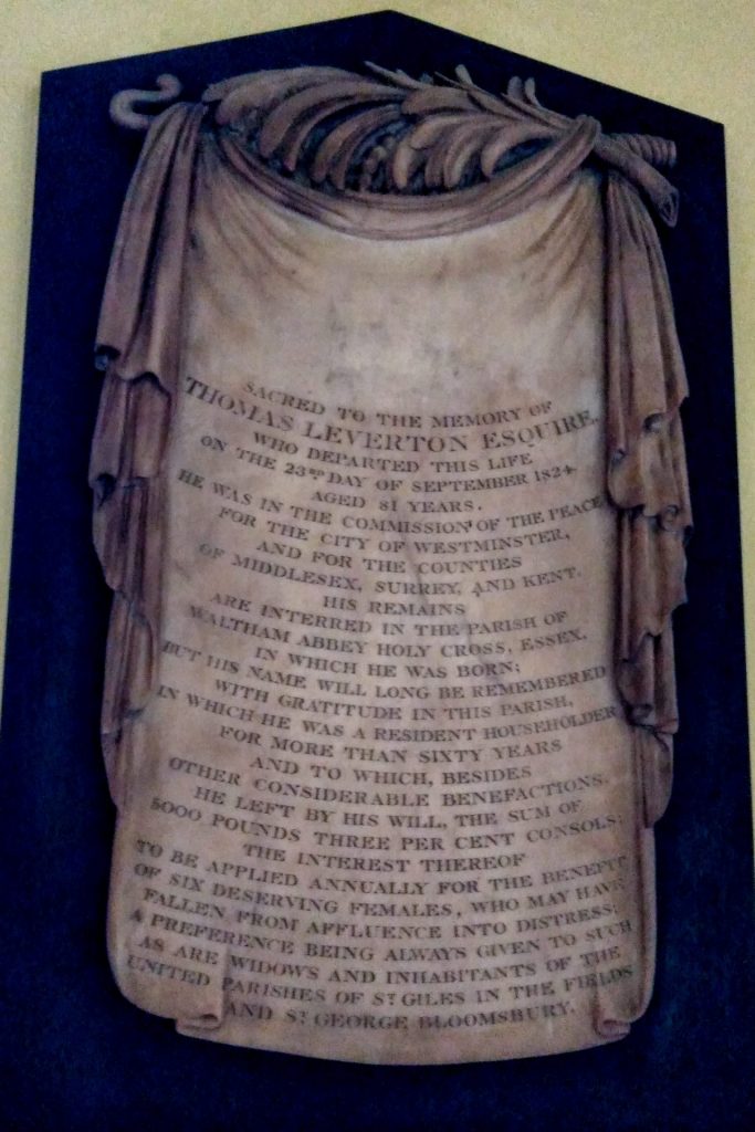 When he died in 1824, he left a reversion at the death of Mrs Leverton of £5,000 3% Consols to trustees ‘the interest thereof to be applied annually for the benefit of six deserving females who may have fallen from affluence into distress, a preference always being given to such as are widows, and inhabitants of the united parishes of St Giles-in-the-Fields and St George’s Bloomsbury’.