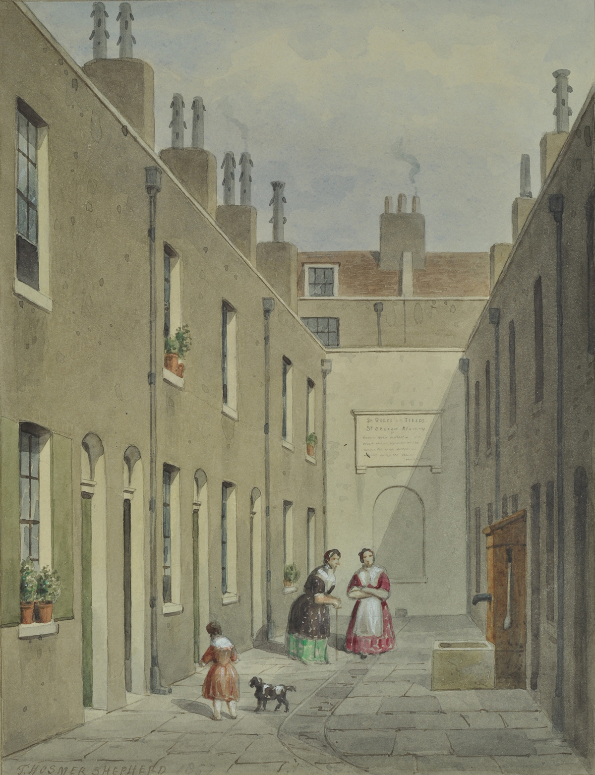 In 1656, the Earl of Southampton granted land in Broad Street (the present St Giles High Street), at the north end of Monmouth Street, for a term of five hundred years, to build five almshouses for aged widows. The parish of St Giles paid for the building of the almshouses. The almswomen in the 1730s received an allowance of £2/8s a year and twelve bushels of coal, and at Christmas and Whitsuntide, 20 shillings each from Lady Dudley’s gift.