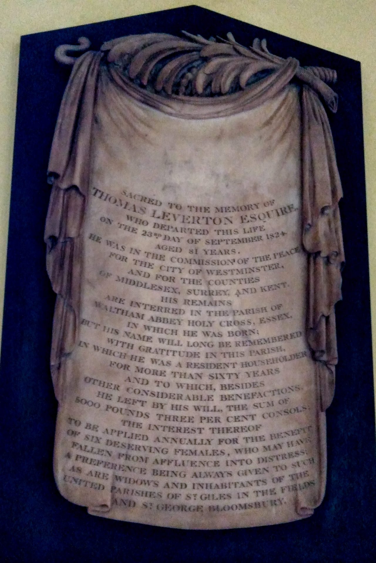 When he died in 1824, he left a reversion at the death of Mrs Leverton of £5,000 3% Consols to trustees ‘the interest thereof to be applied annually for the benefit of six deserving females who may have fallen from affluence into distress, a preference always being given to such as are widows, and inhabitants of the united parishes of St Giles-in-the-Fields and St George’s Bloomsbury’.